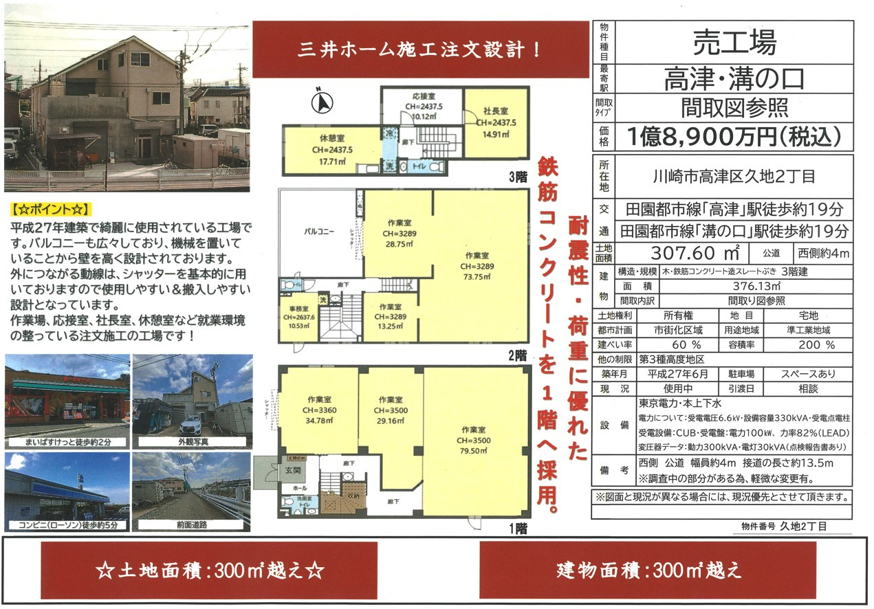 価格は1億8,900万円(税込)二子新地・高津・溝の口エリアで、ここまで美しく整った工場物件は非常に希少です。